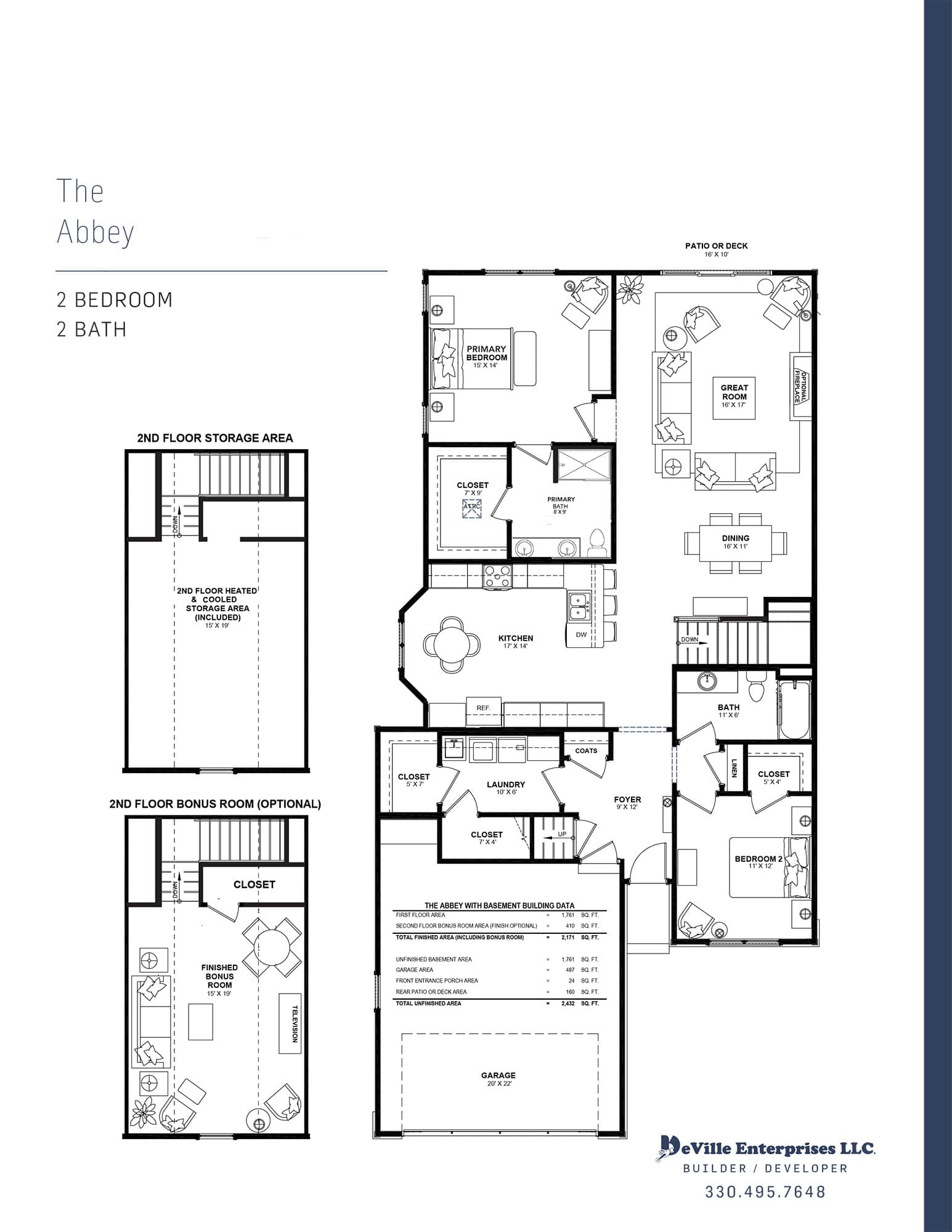 The Abbey plan is designed to maximize its 1707 sq. ft. of main floor living space. It has all of the features you would expect to find in an up to date floor plan. An open concept Great Room, with access to outdoor patio space, a traditional Dining Area and an open Kitchen. The 17’x14’ Kitchen includes space for casual dining with a bay window and bar seating. The split bedroom plan provides for maximum privacy for the Master Suite and the Second/Guest Bedroom area. The Master Suite features 15’X14’ living space, a Private bath and a walk-in 7’X9’ closet. The Second Bedroom located off the foyer also features a walk-in closet and access to a second full bath. The 10’X6’ Laundry Room adds additional storage space with a 7’X4’ walk-in closet. Standard in the Abbey plan is a staircase located off the foyer accessing an upper level 15’X27’ bonus room that is climate controlled. This space can be finished as an additional living space. The Bonus Room adds 410 sq. ft., for a total of 2117 sq.ft. of living space. The Abbey can be built with or without a basement.